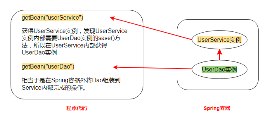 (6) Bean的依赖注入分析 目前UserService实例和UserDao实例都存在于Spring容器中,当前的做法是在容器外部获得UserService实例和UserDao实例,然后在程序中进行结合。